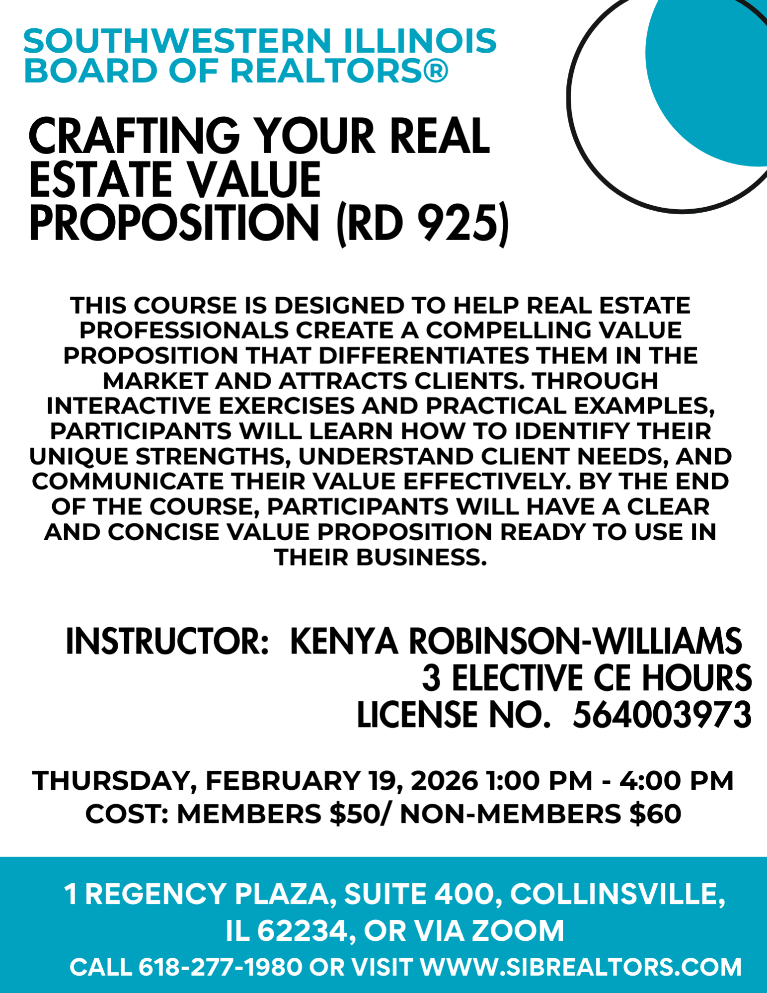 This course is designed to help real estate professionals create a compelling value proposition that differentiates them in the market and attracts clients. Through interactive exercises and practical examples, participants will learn how to identify their unique strengths, understand client needs, and communicate their value effectively. By the end of the course, participants will have a clear and concise value proposition ready to use in their business. Course number: 564003973