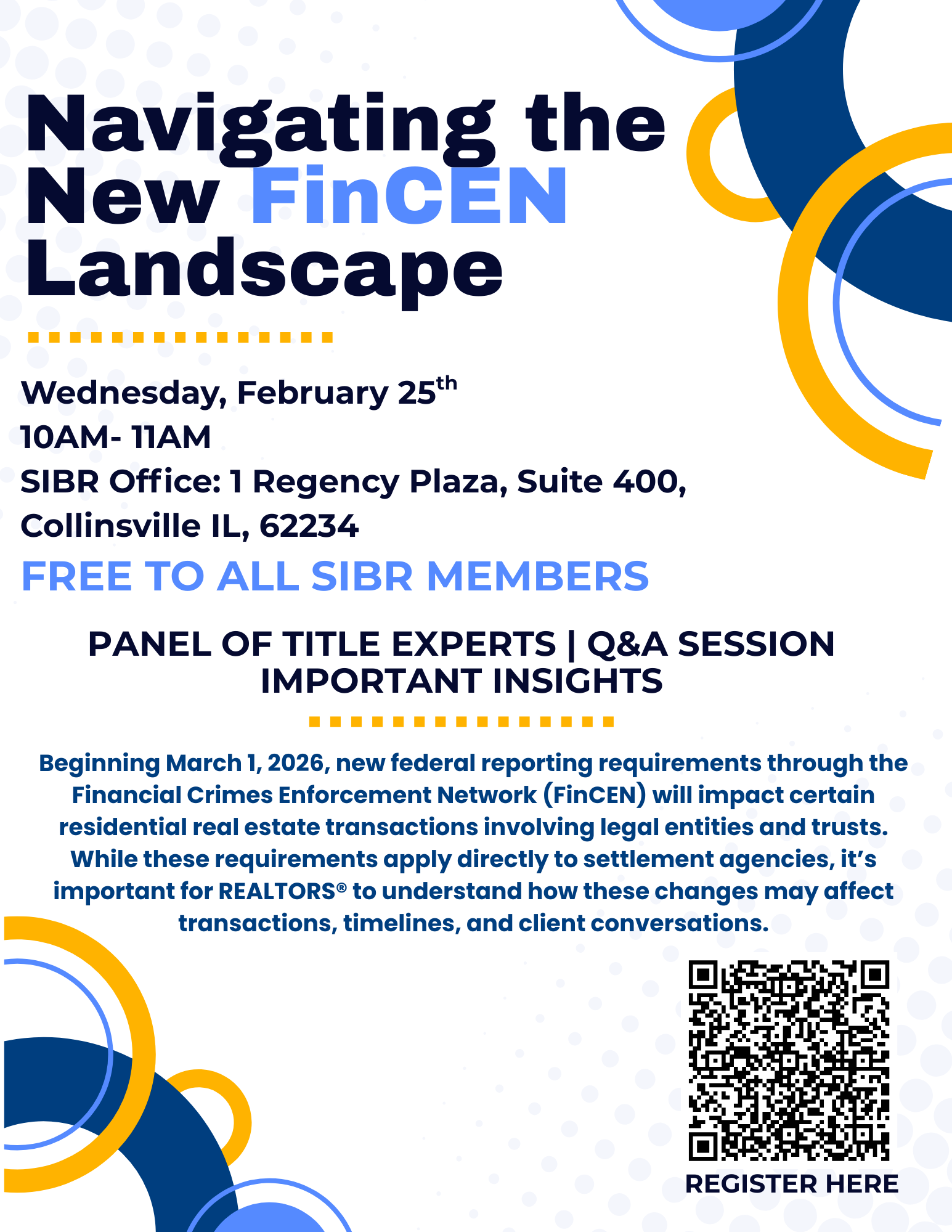 Beginning March 1, 2026, new federal reporting requirements through the Financial Crimes Enforcement Network (FinCEN) will impact certain residential real estate transactions involving legal entities and trusts. While these requirements apply directly to settlement agencies, it’s important for REALTORS® to understand how these changes may affect transactions, timelines, and client conversations. To support our members, SIBR is hosting an educational session in partnership with our affiliate title companies. This program will feature a panel of title professionals who will walk through the new FinCEN requirements, explain what’s changing, and share practical insights on what REALTORS® should expect moving forward. This is a valuable opportunity to hear directly from industry experts, ask questions, and gain clarity on an important regulatory update that will soon impact our market.